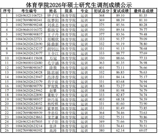 《中央民族大学体育学院2026年硕士研究生调剂成绩公示》已发布(见附件),如有异议,请于4月13日—4月19日通过电话或者邮件反映至体育学院办公室。联系电话:010-68933154 / 010-83874935,邮箱:muctyxy@163.com。